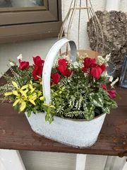 シクラメンの寄せ植え カインズさんのガーデンシクラメンの寄せ植え、近くで開催が無く、自己流で真似っこしてみました^ ^シクラメンの根鉢が意外と大きくて苦戦💦花材に助けられてなんとか完成🌸🌸我が家は冬とても寒いので、年明けには家🏠の中に入れます。
