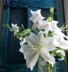 庭の花便り たぶんカサブランカだと思うのですが、白いキキョウと一緒にドアオブジェの前に飾ってみました😆白い花だけ、涼しい感じですユリの香りでいっぱいです☺️ 庭に出ると、ふと、どこからか、いい香り花粉の色が鮮やかですたぶん、カサブランカだと思います😅1本に7つの花とつぼみがあります後ろにも