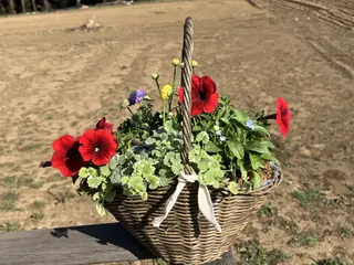 春のカゴ寄せ植え 2日前に作ってきました🎵今日は昼間暖かくなったので、外に出してみましたよ❣️色選びに悩んだペチュニアの赤い花が、たくさん花を開いて元気もらえそう😄🙌実家に持って行こうと思って作ったのですが、、可愛くて、、どうしよ🤭