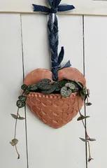 WSオーブン陶芸参加 コチラの投稿で自由な形で作れると分かりWSのオーブン陶芸行ってきました😊やりたかった鉢作り🪴 ハート型でぶら下げるタイプにしてみました。思い描く物が出来るかダメ元で挑戦してみましたが、無事完成✨上に紐を通す穴と後ろの下に底穴を空けました。道具は何も持って行かなかったのでWSのヘラでグリグリ😅 タピオ