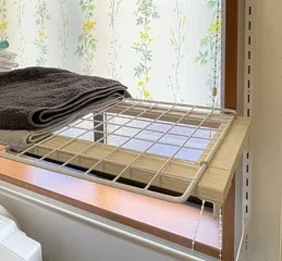 ワイヤーネットで棚板! カインズさんのワークショップに参加して学びました☆ありがとうございました✨ ※棚柱や棚受けなど、全部合わせると8000円以下で、幅90cm、稼働棚2段、物干しバー付き壁面収納ができました😆👌