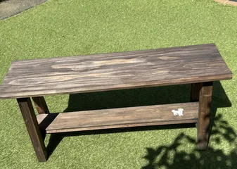 カフェ板ロングベンチ *今年度作った作品*この作品はダボ埋めが多く、ひるんだ私は一度キャンセルしたのですが 気を取り直して作ることを決めた作品です😅あのノコギリが慣れなくて…不器用丸出し😅 色はブラック 帰ってから🐶のステンシルをしました😊