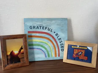 初めてのミニサインボード😆🎵 サインボードの作品をたくさん見てきて、良いなぁ🎵と、センスのない私は無理だろうと諦めていましたが、ついにチャレンジ‼️グラデーションと上手く出来なかったけど、作品1号としては、まずまずかな?大好きなハワイアンの虹を🌈イメージしました😍