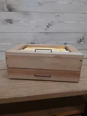 ゆぴのこさんのアクセサリーBOX💍 BOX💍です細かい工程が沢山ありゆぴのこさんのWSだけで使える便利グッズを使い✨楽しく作り上げました😊蓋を開け引き出しを出したところです✨上の段には、DAISOのアクセサリー入れがピッタリ2つ下の段には1つ入ります色はウォルナットを水で薄めて塗りました😊毎回とっても楽しいWSです♡ゆぴのこさん、アド