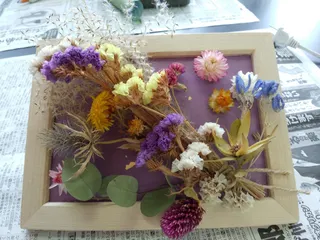 ドライフラワーの壁飾りです。100均のフォトフレームにドライフラワーを束ね、グルーガンで接着します。ホワイトボードに説明が!材料ですみんな違ってみんないい先生から「お家で、また違う花で作ってみてください😊」 撮影、投稿許可いただいています。