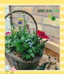 春の寄せ植え🌼 午前中のグリーンWSで寄せ植えをしてきました😊素敵なカゴ🧺に、可愛いお花を寄せ植えしました✨今日は天気が悪く寒いですが…綺麗なお花を見ると あたたかい気持ちになり、癒されます❣️これから色々な お花を咲かせてくれると思うと…楽しみです😄♬