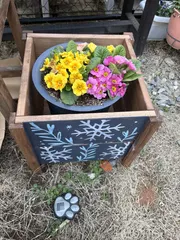 ボックスプランターに寄せ植え せっかく使ったプランターに中々見栄えがする花が中々なくやっと綺麗に見えるかなと思ってジュリアンを植えてみました。、プランターは冬の柄ですけどね😅