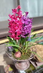 球根を使ったアンティーク寄せ植え🪻その後 綺麗に咲いてくれました✨️いつもは2階の日の当たる所でとっても良い匂いをさせてくれているので…今日は風もなく良い天気なので🌞外で少し日向ぼっこさせました🥰もう少し…楽しませてくれるかなぁ💞