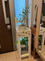 以前、ワークショップで作ったチェア型ミディアムガーデンスタンド。下に100均のすのこをバラして作成した板をはめて2段使えるようにし、ステンシルにも初挑戦して、グリーンを置いてみました。ステンシル、一つめが塗料が多くて滲んでしまいました。修正はしたけど汚い😢それ以外は…まぁ初挑戦だからこんなもんでしょ