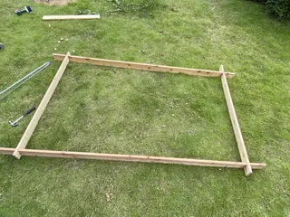 庭にパーゴラ7 柱を立てた後は、パーゴラ上部の梁の組み立て。 この前作った自転車小屋の屋根でもやった相欠き。 あんまり正確じゃないけど、とりあえず完成。と思いきや、枠だけで満足してビス止めしてしまいました。枠の中に縦向きの桟を数本渡すのを忘れてしまいました。もう疲れたので、来週やりたいと思います