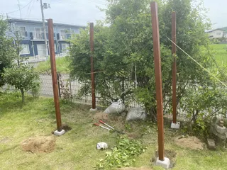 これはDIY? 近々犬を家に迎える予定があり、庭で遊べるように改造中! 生い茂った草木をキレイにして、カインズで買った丸太杭を打ち込んでみました! 中々の強度だったため、庭の木と繋げてハンモックをつけてみました。 …! じわじわと杭が斜めに…。 夢のハンモックは断念。 次回に期待しましょう。