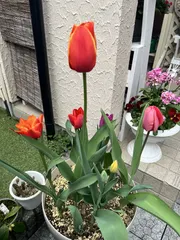 グングン伸びて全咲き ……とは、まだ言えませんがやっと色付いてきましたーチューリップ*.🌷.*まだかまだか😵と毎日覗いて見てたのですが皆さんの投稿を見てるとウチの🌷たち遅いなーと思ってました。玄関前が、やっと春🌷🌷🌷