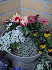 葉牡丹とビオラを植えていた鉢に春の寄植えしました✨葉牡丹は抜いたけど💦ビオラはまだ咲いているので一つ残して植え替えました👍なんとチューリップは3苗付いて150円と格安でした🥰