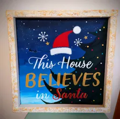 昨日の業務連絡の現場で(笑)作ってきたサインボードです♥ 楽しくアハハ❗オホホ❗で工房で作業してたのはここまでバッグのモミの木は適当過ぎる手描き🖌🎨💦 「believes」の文字はDAISOのメタリックペイントを持込で使ってみましたが💦恐ろしい事にステンシルシートを剥がすときに一