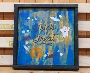 フレーム付ミニサインボード 今日は、B&Bのフレーム付ミニサインボードを作ってきました😊夜のハロウィンにしてみました。ベースをパインで塗ってから、青色を塗って、枠にもパインを塗ってから、黒とブルーを混ぜた色を塗ってます。そのあとステンシルをしました。とっても楽しかったです🎶今は、玄関先のシューズラックの上に飾ってます😁