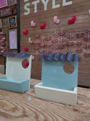おうち形多肉プランター 今日 マイストアでおうち型多肉プランター2個目作ってきました😆右が私です高校の時の友人と一緒に😆彼女は今回初めてのDIY参加です👍とっても楽しかった〜ハマるのわかるわ〜って言ってました😆DIY沼へ引きずり込もうと思っています(笑)素敵なバレンタインディスプレイの前で😍 もたもたしていて遅く