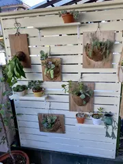 夏のDIY2022「すのこから多肉ウォール」 20年近く押入れで眠っていた敷布団用のすのこ、木製だし、何かに使えないか?…と捨てずに取ってありました。折りたたみ用の金具を外し、3分の2と3分の1の2つに分け、大きい方に塗装して、多肉をかけたり置いたりできるウォールにしてみました。玄関先のお隣との境に設置、フェンスも兼ねています。冬は全く陽の当
