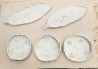 初めての陶芸教室 昨日久しぶりのパールさんと陶芸教室に行って来ました🎶最初からはっ葉の形のお皿を作る予定で、色はやっぱり白が良いなと思い決定💖お皿の形もイメージで2枚作れました✨粘土を柔らかくするため水を加え良く練る、楽しいが以外に力が入り手が痛い…焼き上がりが楽しみです💕アドバイザーさん、パールさん、ラムちゃんさん