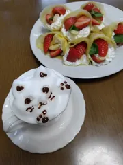 お土産のクレープ生地でクレープを焼きました。2回目なので上手く焼けたかな。フライパンもカインズのものを買ってみました😄ラテアートもチャレンジしましたが、なかなか思うようなアートになりません😅一応猫です💦焼き上がったクレープ生地カインズさんのフライパンで
