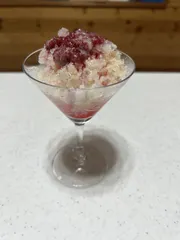手作り練乳・やまももペースト(かき氷) 牛乳、サトウキビの島砂糖、スキムミルクで練乳を作りました。上白糖では無いので、褐色。以前冷凍しておいたやまもものペーストと一緒にかき氷を作り涼んでいます。