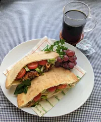 コーヒーは毎日ドリップして楽しんでいます。食事にも合うように、濃いめにしたり、薄めにしてみたり変えています。 この日は、ケバブ風サンドに合うように、ちょっと濃いめに淹れてみました。 ケバブ風サンドは、簡単に作っています。市販のピタパンを軽く焼き、某フライドチキン店のチキンをほぐし