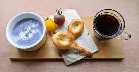 夏のコーヒー時間【コーヒーと楽しむ朝食】 朝早くコーヒーを淹れています☕コーヒーに゙合う朝食を考えるのも好きです。この日の朝食は、自宅で収穫した紫ジャガイモ(シャドークイーン )のスープに、スプーン型に手作りしたパンです。このスプーンで、スープを飲みながらスプーンもかじっちゃいます😋このパンとコーヒーもよく合います🥰