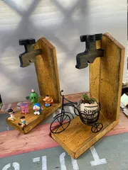 はるかのんです。 蛇口の型をジグソーでくり抜いて全て 端材で作成しましたので製作費 ¥0です🙌ついでに2個作りました😉 右側に飾ってる三輪車は、はまたこさんの手作りで卵の殻の器に多肉の寄せ植えですプレゼント🎁していただきましたありがとございました💓 &nbs