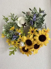 向日葵のリース 8月に入りましたね。 ってことで、毎月作っているリースを向日葵を使ってリースを作ってみました。 玄関が日に日に明るくなっています。