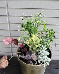 冬の寄せ植え❄ カインズでゴシキヒイラギを見つけたので寄せ植えを作りました☺️ 他にヒューケラ2株 千日子坊 モクビャッコウ 家にあったユーフォルビアフロスト(少しボリュームが足りない💦)を加えましたちょっと早いけどchristmas