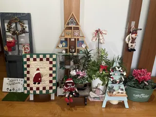 ■作品内容玄関に今まで作った作品を飾ってます☺️■工夫ポイント20年以上前に作ったカントリードールのサンタさん🤶黒いうさぎもお気に入りです💖こちらも20年以上前に作ったタペストリーパッチワークと刺繍で、本を見ながら作りました♪こちらは昨年ダイソーのステンシルシートで作りました⛄️リースも前に作った物
