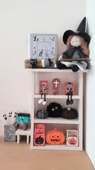 ミニ足場風3段ラックにハロウィンの飾りです ■作品内容過去に作ったミニ足場風3段ラックに、小さな作品を飾りました。①カエルのおもちゃをリメイクした黒猫②魔女の人形③捨てるほうきから作った魔女のほうき④端材で作った足ブラオブジェ⑤端材で作った棺桶オブジェ⑥布で作ったカボチャ⑦モコモコ毛糸のモンスター⑧端材にイラストを描いたプレート2種⑨汚し塗装