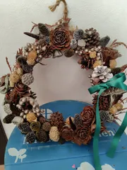 ■作品内容クリスマスリース■工夫ポイント小さく束ねたグリーンを巻き付ける時、リースの厚みと形に注意。ワイヤーばかりだと廃棄の時大変なので、輪ゴムで巻いた。■使用した商品・家でとれたもの ヒバのようなグリーン ユーカリ バラの実 椿の実の殻 綿花 小枝・拾ったもの 松ぼっくり 杉などの木の実・購入した