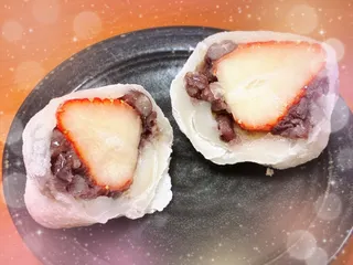 白玉粉とお砂糖とお水を混ぜて タッパーに入れて 電子レンジ500wで2分を(1回目)(2回目👍)2回繰り返すだけの 楽ちん求肥ですが… なかなか餡子(それも粒あん)で包んだイチゴ🍓を求肥で包むのがたぁ〜いへん💦でした。 がっ…なんとかチャレンジ成功し