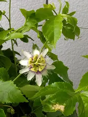 パッションフルーツ 初めての栽培です 今日、やっとパッションフルーツの花確認出来ましたーとても綺麗です 今迄に 2回咲いたのですが知らない間に開花して気が付けば落花🤣🤣でした 今回は蕾が確認できたので毎朝見に行き待ってました人工受粉できました✌️今頃の開花で結実するんでしようか??&nbs