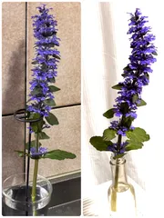 フラワースタンド フラポ フラポ使ってます😁アジュガを挿してみました。左フラポ 右が空き瓶💕下は庭のアジュガ