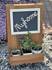 黒板付きフラワースタンド ずっと作ろうか迷っていた作品ですがやっぱり作って良かったです💖こうして鉢を並べて飾ってみるととっても可愛いですね😍セリアで買った文字ロープを黒板のところに付けてみました