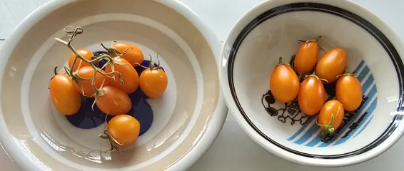 朝ごはん(朝採れミニトマト🍅とストックミニトマト🍅🤭) 左のお皿がストックの🍅右のお皿が朝採れの🍅🤭朝採れのほうはメチャ甘😋💕でした~♪