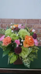 薄緑のトルコキキョウとオレンジのバラのアレンジフラワーワインレッドのスカビオサがいい感じ😆 お花屋さんでの楽しかった1年 すごく勉強になりました。