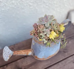 ■作品内容以前雑貨屋さんで100円で買ったサビサビのブリキジョウロに寄せ植えしました🚿底に穴をあけました。すげーサビサビ🤣■工夫ポイント水抜きの穴をあけました🕳️🪛割とジョウロの背が高いので、ルビーネックレスをたらりんとして、動きを出してみました😊※以下多肉ハック部門のみ入力■材料■工程