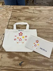 アデリアトート&ポーチ ■作品内容 アデリアレトロトートとポーチ ■こだわりポイント ・白色で花の周りや茎を塗る時は、下地がベージュ系なので濃いめになるようにしたことと、少し黄緑で少し影をつけたこと。 ・メインの花は単色の赤、チューリップの花や葉の色は見本は単色のオレンジ?でしたが、黄色と赤を使って混色で、その時