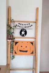 折り畳みラダーにハロウィンの飾りです ■作品内容過去に作った折り畳みラダーに、作品を飾りました。①端材に描いたなんちゃってガーランド②もふもふ毛糸で作ったモンスターリース③100均シートまな板を切り抜いたカボチャ④鳥かごの中のポンポンモンスター鳥かごは過去の作品です。■こだわりポイント玄関入って正面になるので、目を引く物を飾りました。あ