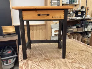夏のDIY2022 引き出し付きサイドテーブル 7月 3作目😄引き出し付きサイドテーブルです。買ったばかりのインパクトを使って見たいなあ!と思い、前日に練習までしたのですが、失敗ばかり😢恥ずかしくて、持って行きませんでした。が!作業台にインパクトが。下穴開けは、インパクトを使いました。作業が早くなりますね。引き出しは、既製品を使います。最後は、ア