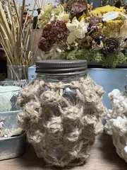 マクラメポコポコビンホルダー ■作品内容マクラメポコポコビンホルダー2個目の今回は麻ひもで作成✨ ■こだわりポイント教えて頂いたものを思い出しながら麻ひもでチャレンジ👍✨麻ひもの色合いがとても好みのビンホルダーが出来上がり💓ただ、1つ1つのポコポコの止めをしないまま最初から最後まで編んでしまっていて😅ポコポコの立ち具合