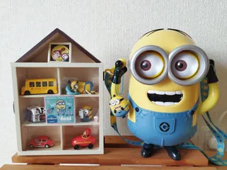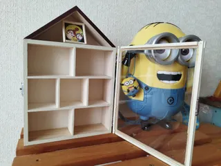 コレクションBOX(二代目) BOXの中身がいっぱいになったので新たに作りました⤴ 今回はDAISOの330円のな屋根に色を塗り🎨アクリルボードで扉を付けてみました☝️裏側は雑なつくりですが🤭 好きなミニオンが🎶なかなか集まらないので寄せ集めで😆とりあえず完成🎊