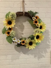 ひまわり🌻リース 昨夜突然ひまわり🌻のリースが作りたくなって、閉店時間間近なダイソーさんで花材をゲット❗️花材の配置に悩みましたが、まあまあ可愛く出来たかな😅夏の間玄関🚪に飾ろうと思います😊