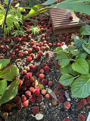落ちてくる山桃の実 大変な量なのです。まだ、まだ木にいっぱいなってるので、7月いっぱい位まで続きます。山桃の実は足が早くて長持ちしないので、スーパーで流通しない貴重な実なんですが、大木なので、落ちる量が半端じゃないのです。少しくらいジャムや甘煮にした所でおっつきません。虫が来て食べ尽くして、種になるまで待つしか無いので