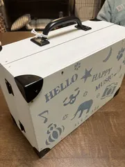 昨年作成したトランク風小物ケース✨角にガードを取り付けて、片面にたくさんステンシルをして、こんなに賑やかになアレンジになっちゃいました😊🎶こちらいつもメロディのお泊まり用ご飯を入れるボックスとして大活躍中です🐶🍽️✨裏側にはステッカーを貼り、ハンドルにはお守りを付けて、まるで寅さんのラゲージさながら