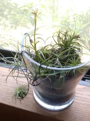 またまたガラスの器が出てきました! メダカ飼ってたわぁ そこにエアプランツ、玄関前に段ボールに入れて放置、時々水浴びいつの間にか真ん中の親株から6個の子株に増えていました!健気なエアプランツに敬意を表し、この器を進呈。 エアプランツ仲間全員は入りきらなかったので空中遊泳