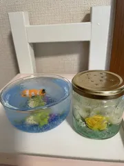ワークショップで作った保冷剤を使って、家で作ってみました☺️同じ保冷剤なのに少し硬く、透明感が出なかったのが残念です💦100均のミニブロック🐠入れました。よく見えない😅100均の造花を入れ、ローズのアロマたらしました🌹蓋の穴は星形です☆