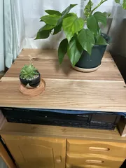 レーザーディスクの上に植物を🪴 急に朝晩冷えてきたので玄関外に出ていた植物を室内へ移動するために急遽作成。カインズで板をカットしていただき単純にビス止め。塗料はBIVOSのオイルワックスで。コレで少しは置く場所ができました。